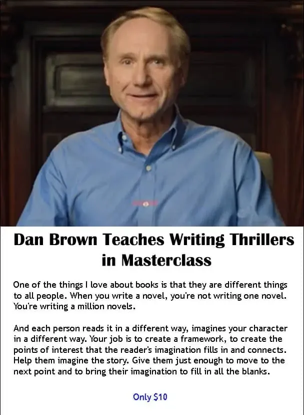 Packed with the excessive-stakes suspense and secret symbols, Dan Brown’s thrillers have bought over 250 million copies and comprise one of many world’s finest-promoting novels, The Da Vinci Code. In his writing class, Dan reveals his step-by-step course of for turning concepts into spellbinding narratives. Learn his methods for researching like a professional, shaping characters, and sustaining suspense all the best way to a dramatic shock ending. This discounted masterclass is particularly designed to speak about writing superior thrillers. But Dan is hoping that it really helps budding writers of all completely different genres. Because what makes thrillers work are parts that really make all tales work. And this artwork type of storytelling is on the core of each single artwork kind. Download the whole masterclass at one of the best-discounted value! Watch it on any gadget you need, sync it with your personal cloud!