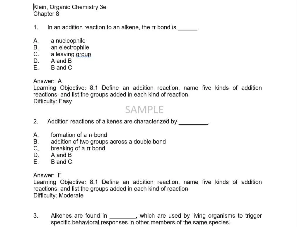 This test bank contains the solutions to questions featured in the textbook Organic Chemistry, 3rd Edition by David R. Klein. Please note that the textbook itself is NOT included in this purchase, but you can find the ebook version of the textbook here or check out related products below.