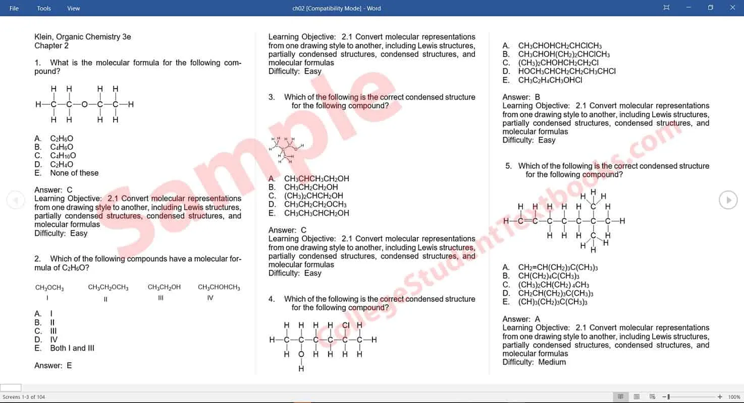 In Organic Chemistry, 3rd Edition, Dr. Klein builds on the success of the first two editions, presenting his innovative skills-based approach to learning organic chemistry. This includes the concepts covered in a typical organic chemistry textbook, with added emphasis on developing skills to support these concepts. Dr. Klein’s unique SkillBuilder examples offer extensive opportunities for students to develop proficiency in the essential skills required for success in organic chemistry. This test bank is an excellent resource for students seeking to improve their proficiency in these skills.
